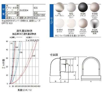 自然給排気口を被う深型フードです。強風時の雨水の浸入を軽減します。 特定防火設備対応ダンパー(FD式)は別注にて承ります。